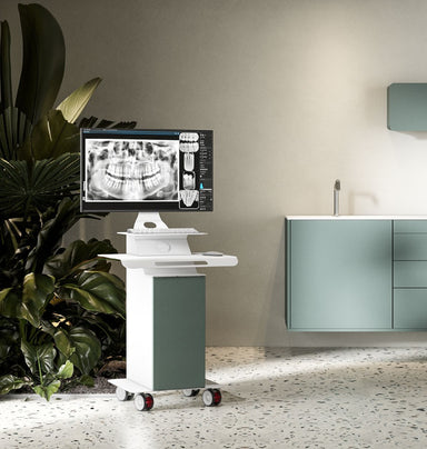 Edarredo Caddie This is a mobile computer cart made for clinics and workspaces where space and hygiene matter. It holds a computer and monitor on t...